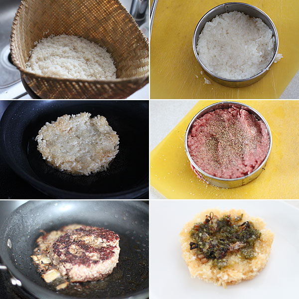 - Take one of the rice patties, and slather it with the Thai sauce. If you do not have Thai three sauce (highly recommend it), then use an Asian chili sauce. Top with the shallots, and burger. Pile on the lettuce, then the remaining rice patty. Spear a few pickles on top, and dig in.
